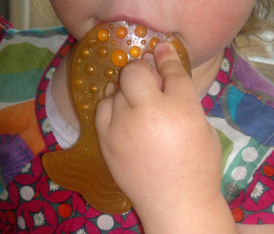 I have tried all the recommended tricks and I have to say, not many work. Sometimes not even the hardcore drugs. But today I came across a wee miracle. It's a piece of rubber shaped like a pimply fish, and known by little Miss Screechypants Soreteeth as "Pishie" (pimply fishie = pishie. So advanced).